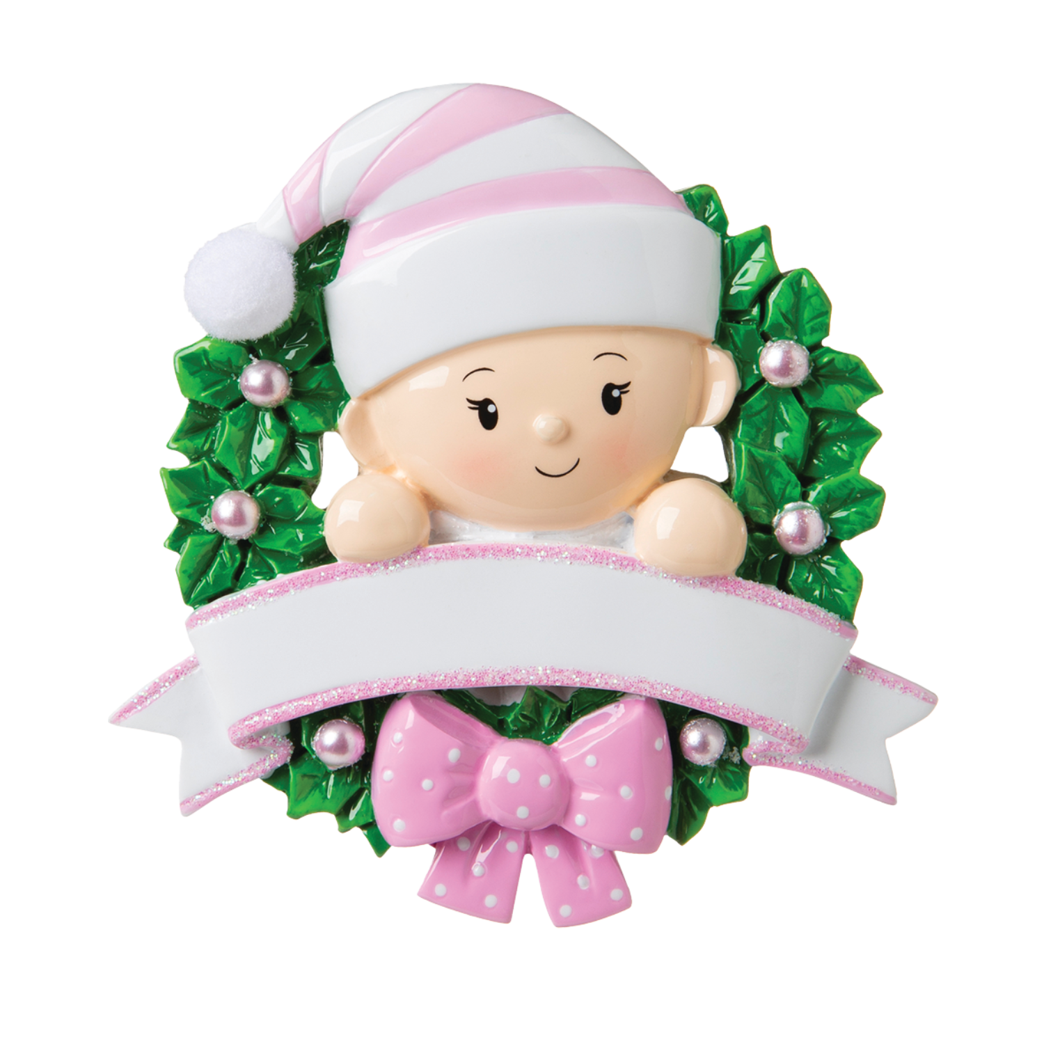 OR1746-P - Baby in A Wreath (Pink) Personalised Christmas Decoration